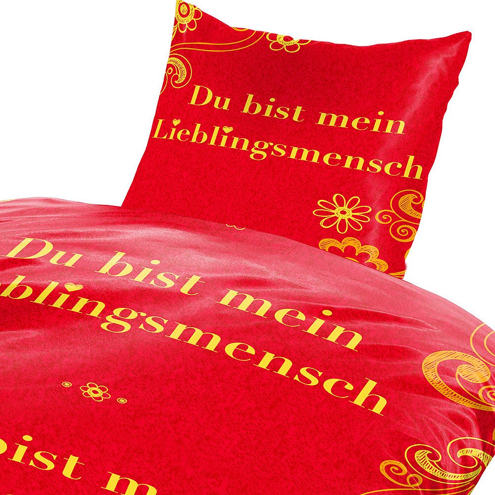 Bettwäsche im LIEBLINGSMENSCH Design. Hautfreundliche Mikrofaser Bettwäsche mit Reißverschluss zum schnellen und problemlosen beziehen von Kissen und Bettdecke. Auch eine tolle Geschenkidee! Lassen Sie sich von der herrlich weichen Qualität mit dem zarten Pfirsichhaut-Feeling umschmeicheln. Mikrofaser ist temperaturausgleichend, feuchtigkeitsregulierend und strapazierfähig. Die Feinheit der Garne sorgt für ein atmungsaktives Schlafklima. Für Allergiker zu empfehlen, Pollen und Milben können sich nicht im Gewebe festsetzen.