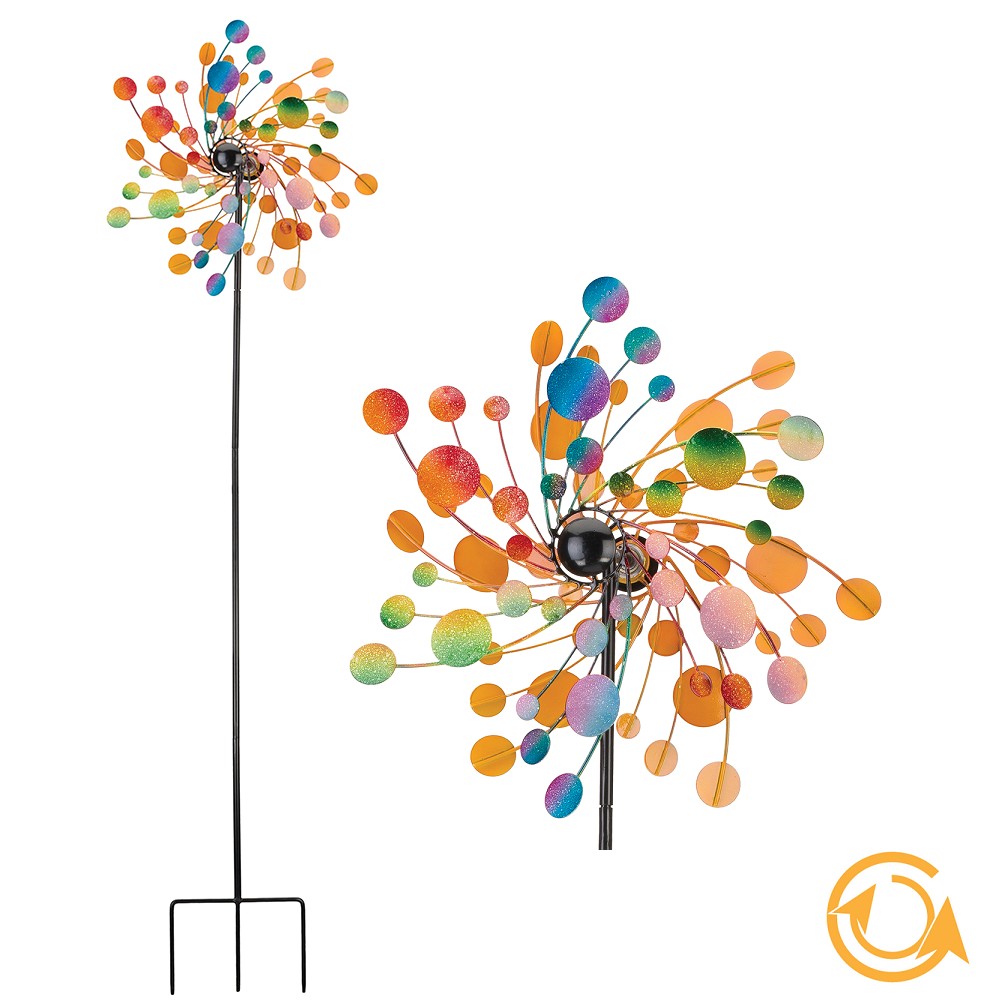 Ein farbenfrohes, lebendiges Windspiel, das mit schönen Farbverläufen in allen denkbaren Farben erstrahlt. Wie der Name bereits vermuten lässt, bestehen die Rotorblätter aus vielen kleinen runden Elementen, die wie Konfetti durch die Luft wirbeln. Das verwendete Metall für das Kugellagergehäuse, die Kugellager an sich, die Lackierung und die Leichtigkeit, mit der sich die drehbaren Elemente im Wind drehen, suchen ihresgleichen. Die Liebe zum Detail, das verspielte Design und die präzise Lackierung sind nur einige Punkte, die für dieses wunderschöne Windspiel sprechen. Die Kugellager, die in einem Gehäuse untergebracht sind, sorgen für die Leichtigkeit der Bewegung. Um das Gewinde unauffällig zu gestalten, wurde in der Mitte des vorderen Windrades eine farblich passende Halbkugel angebracht, die als Gehäuse für das vordere Kugellager dient. Somit ist das Kugellager perfekt verborgen.