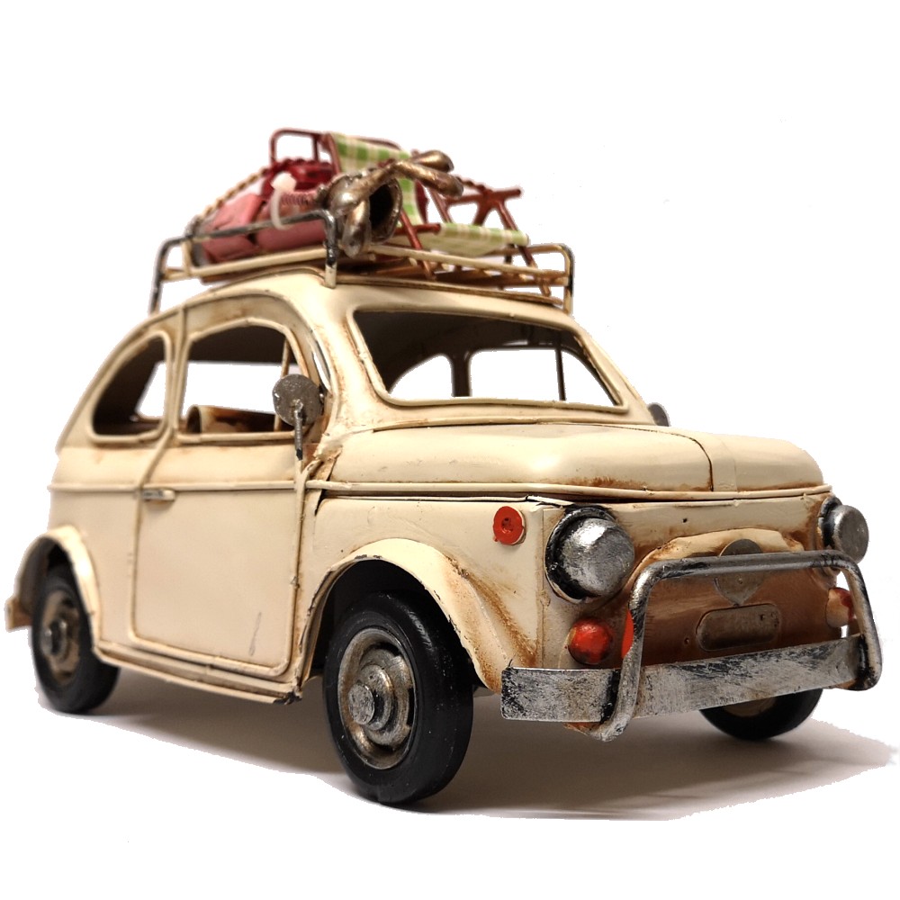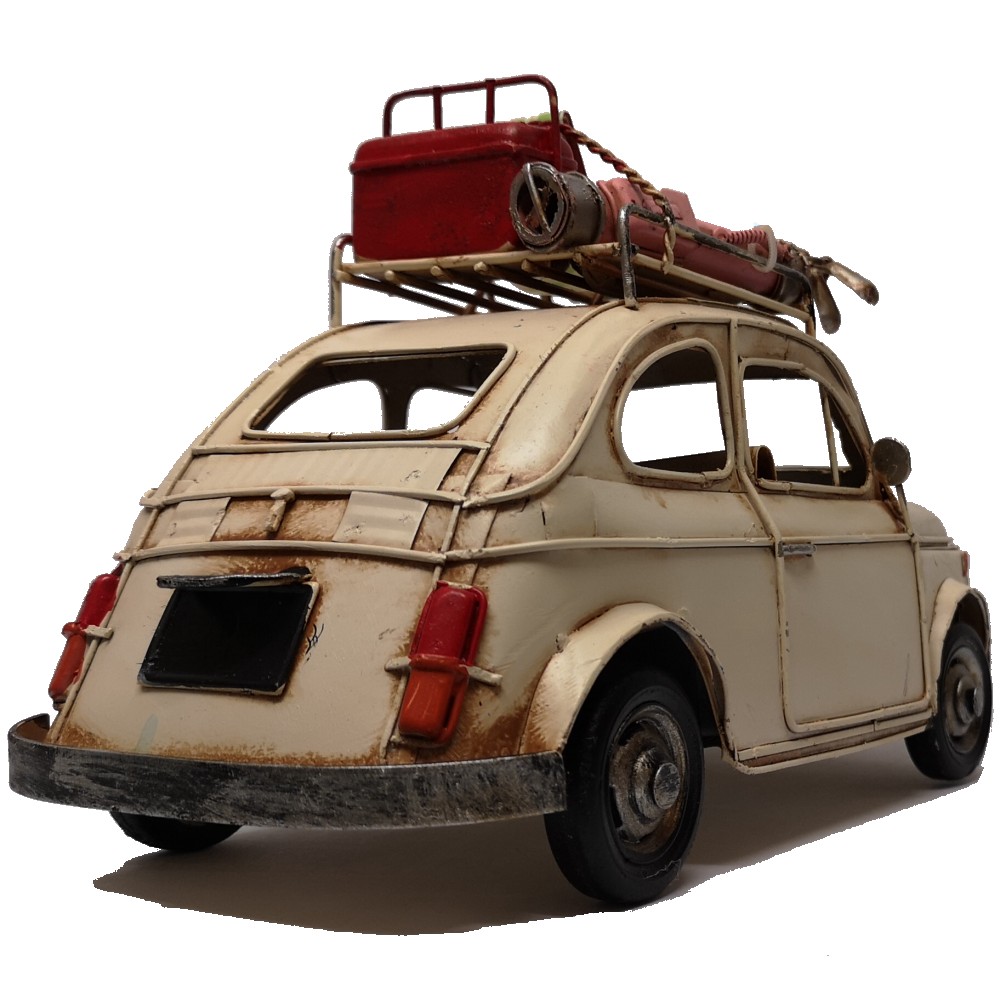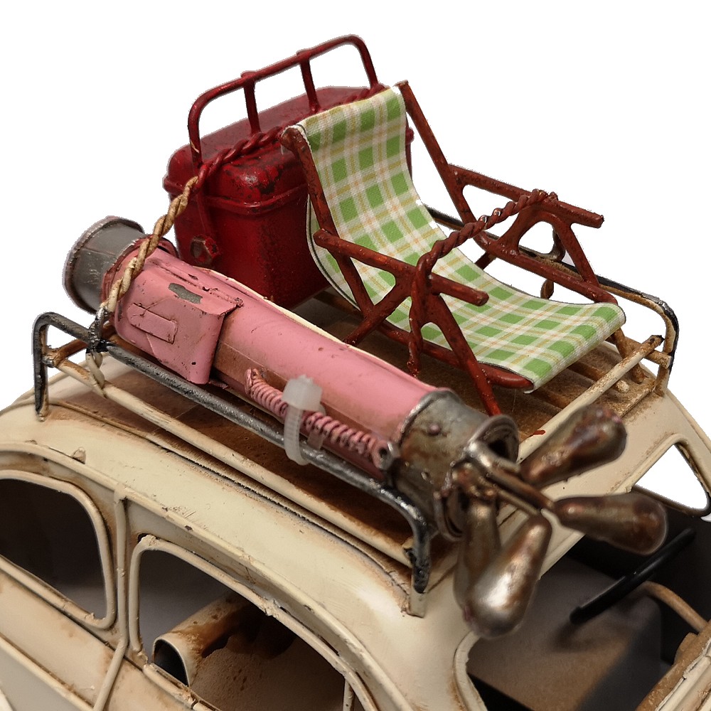 Bei diesem tollen Modell handelt es sich um eine Neuzeitliche Reproduktion eines Italienischen Automodells der 70er Jahre, welches liebevoll Bambino genannt wurde. Es ist handgefertigt und handbemalt. Unregelmäßigkeiten bei der Bemalung und auch bei kleineren Details unterstreichen den nostalgischen Charme dieses Artikels und auch zugleich die Herstellung in Handarbeit. Auf dem Dachträger befindet sich ein Klapp-Liegestuhl, Golf Bag und Kühlbox. Info: es handelt sich um KEIN SPIELZEUG!