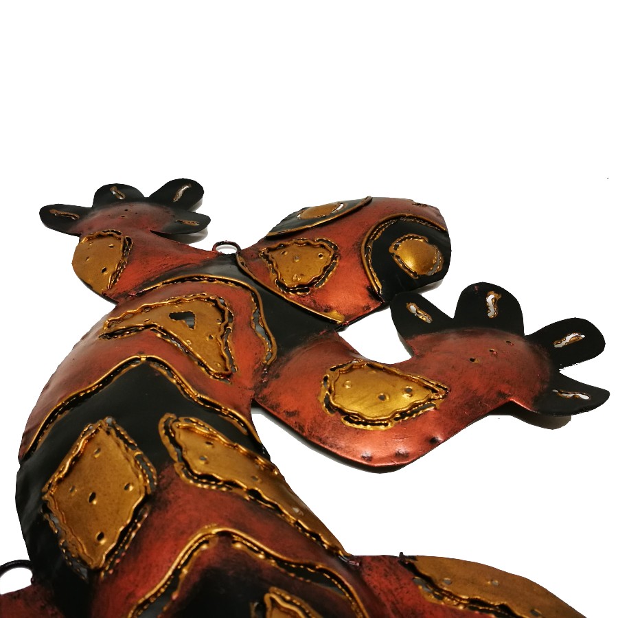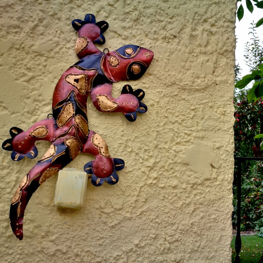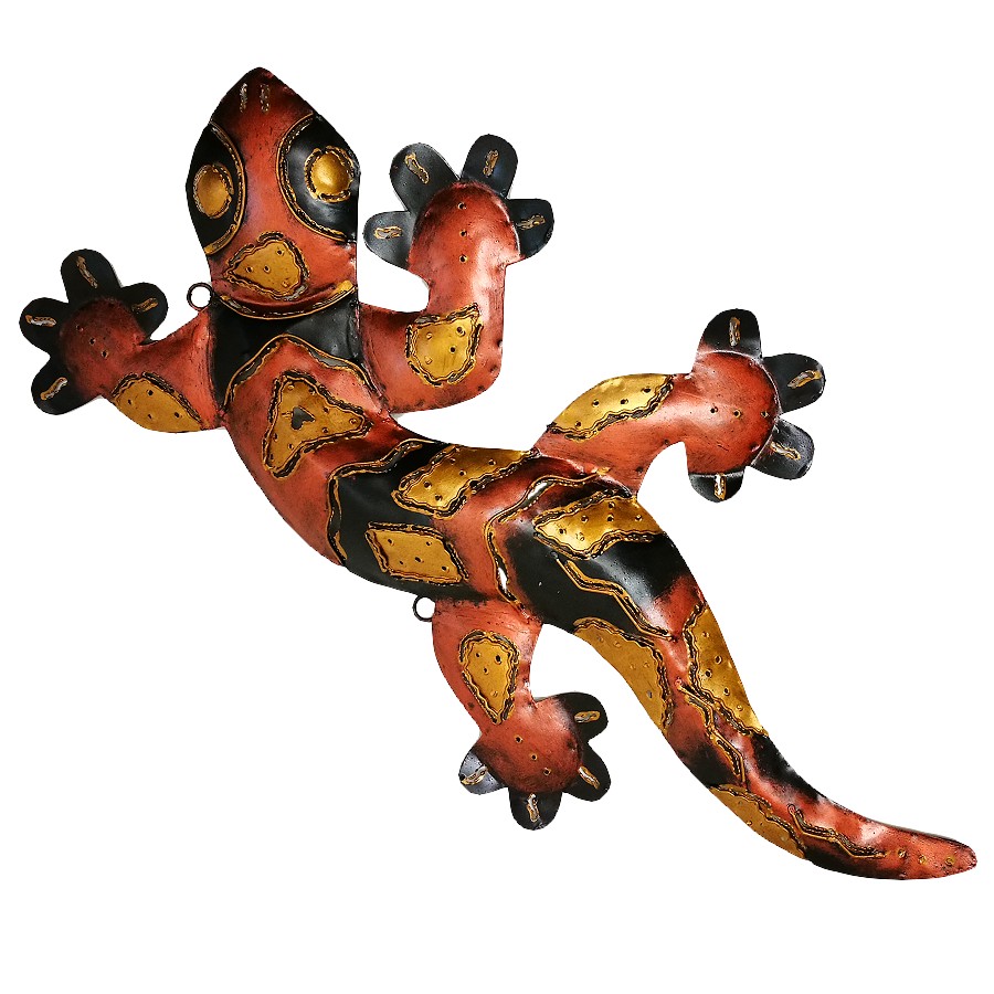 Wunderschöner großer GEKKO als Metallfigur. Gefertigt auf Bali, Indonesien. Eine ganz besondere Dekoidee zum Beispiel für die Hauswand, den Balkon oder die Terrasse. Aufwändig in Handarbeit Handgetrieben und Handbemalt hergestellt. Daher jedes Teil ein Unikat! Geeignet für Innen und Außenbereich.