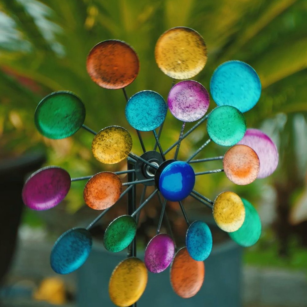 Die Metall Windspiele eignen sich besonders gut als Dekoration im Garten, auf der Terrasse oder dem Balkon. Die beiden Windräder drehen sich gegenläufig im Wind und erinnern in Bewegung an farbenfrohe Planeten, die sich um die Sonne drehen. Das vordere Kugellager ist geschickt durch ein Gehäuse verdeckt und fügt sich nahtlos in die Gesamtoptik ein. Die außergewöhnliche Farbgebung und das verspielte Design machen dieses Windspiel endgültig zu einem ganz besonderen Accessoire.