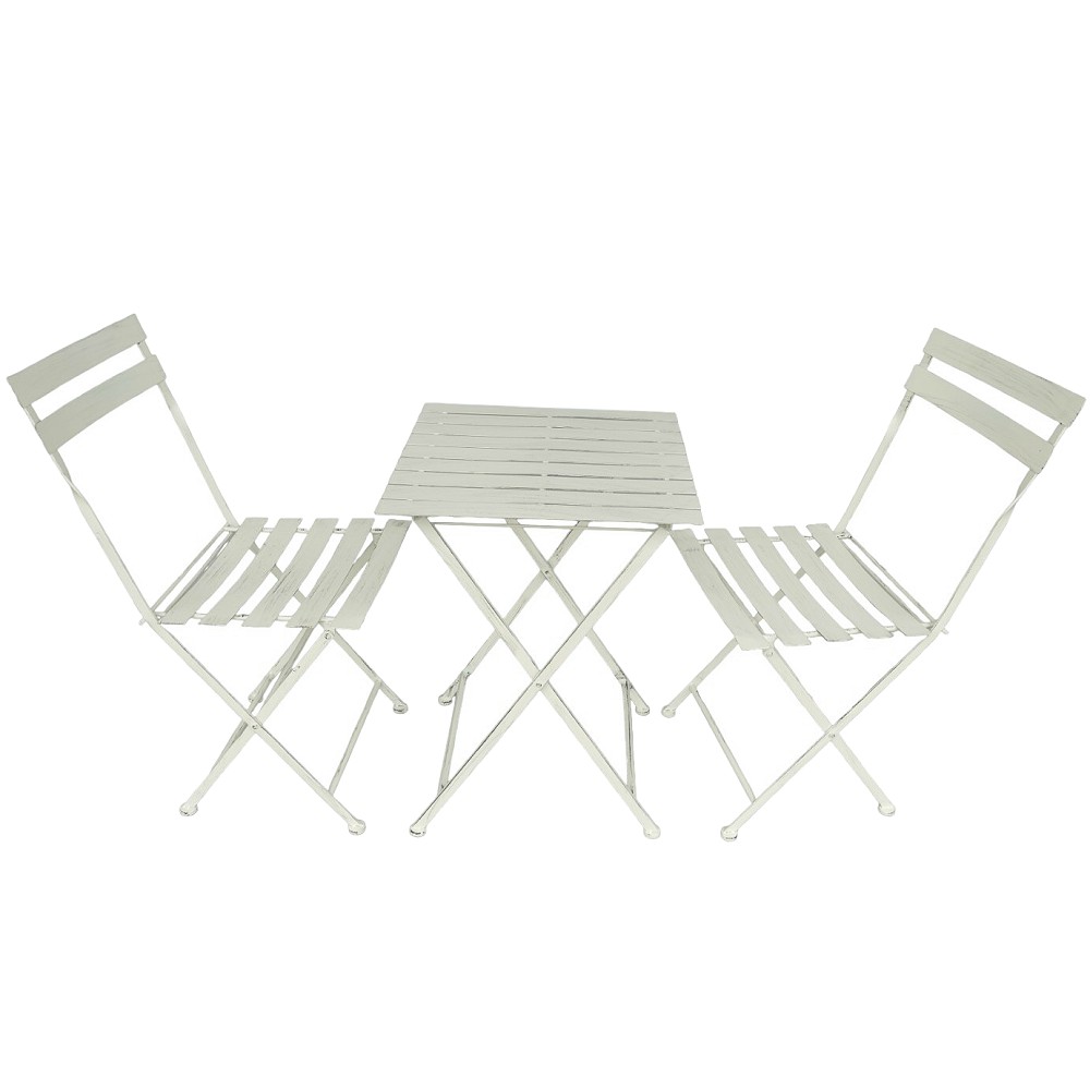 Praktisches Gartenmöbel Set, bestehend aus 2x Stühlen (klappbar) und 1x Tisch (klappbar). Eine gewisse Patina unterstreichen den besonderen Style, wurde so bearbeitet und aufgebracht und ist daher auch so gewollt. Jedes Set hat somit kleine geringe Abweichungen. Dieses Set kann bei Nichtgebrauch einfach platzsparend zusammengeklappt werden.