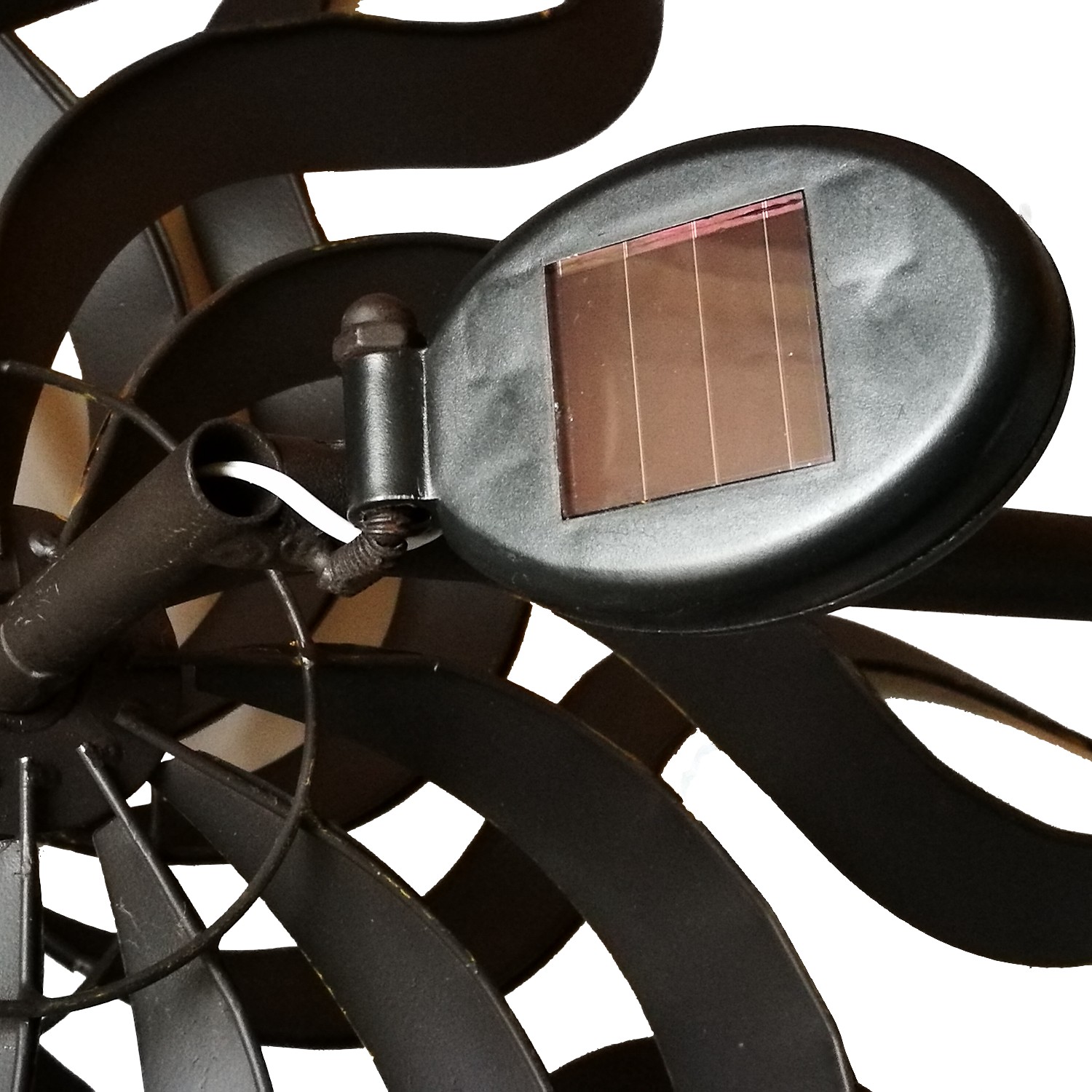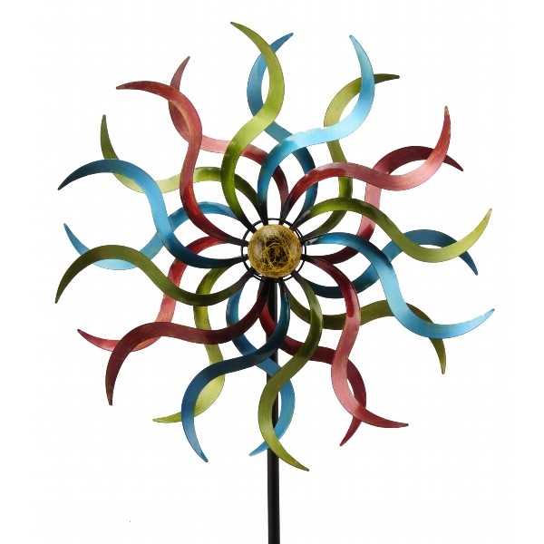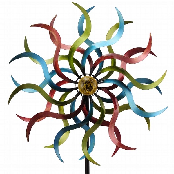 Wunderschönes großes Windrad JESSICA COLOR. Wurde aufwendig und liebevoll aus Metall gearbeitet. Eine außergewöhnliche und beeindruckende Dekoidee für Ihren Garten. Das Windrad besteht aus 2 hintereinander angebrachten Metall Sonnen welche sich senkrecht drehen. Zusätzlich befindet sich in der Mitte der Windräder eine gelbe Glaskugel welche mittels kleinen LEDs und einem Solarpaneel bei Dunkelheit leuchtet. Einfach bezaubernd anzusehen! Die Lieferung erfolgt teilzerlegt, kinderleichter Aufbau - einfach zusammenstecken - fertig! Damit machen Sie jeden Gartenfreund glücklich.