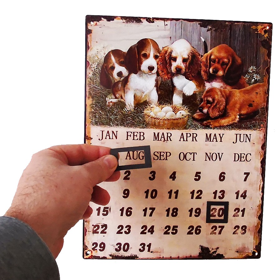 Jahreskalender mit 2x Magneten zum einstellen von Monat und Tag. Die auf dem Schild dargestellten Gebrauchsspuren, sorgen zusätzlich für einen antiquierten Shabby Charakter und sind daher bewusst so gewollt. Der Kalender ist jahresunabhängig ohne Jahresangabe und kann somit immer wieder aufs Neue benutzt werden. Er ist ein Hingucker und geeignet sowohl für den Innen- als auch für den geschützten Außenbereich.