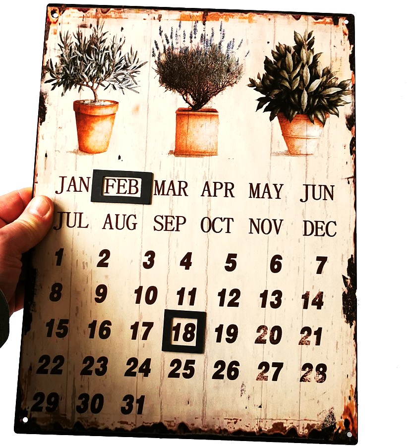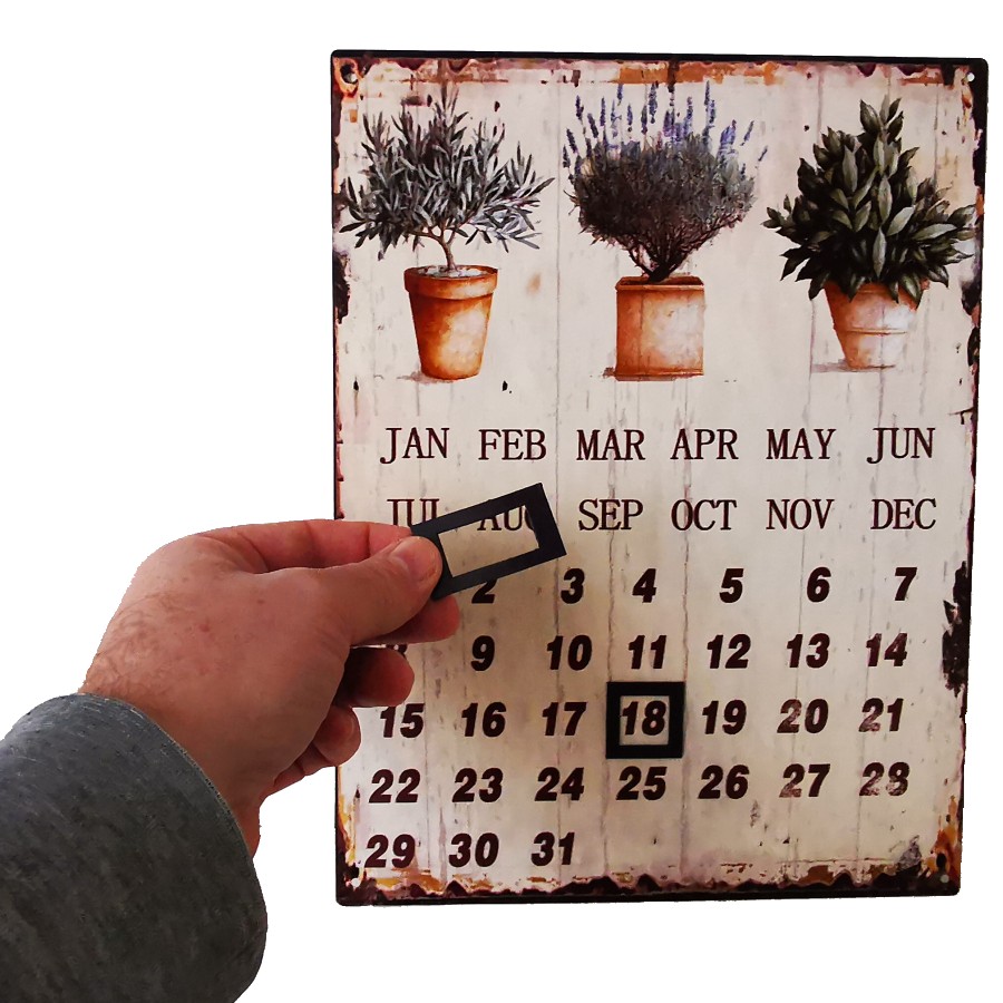 Jahreskalender mit 2x Magneten zum einstellen von Monat und Tag. Die auf dem Schild dargestellten Gebrauchsspuren, sorgen zusätzlich für einen antiquierten Shabby Charakter und sind daher bewusst so gewollt. Der Kalender ist jahresunabhängig ohne Jahresangabe und kann somit immer wieder aufs Neue benutzt werden. Er ist ein Hingucker und geeignet sowohl für den Innen- als auch für den geschützten Außenbereich.