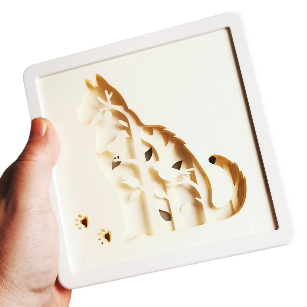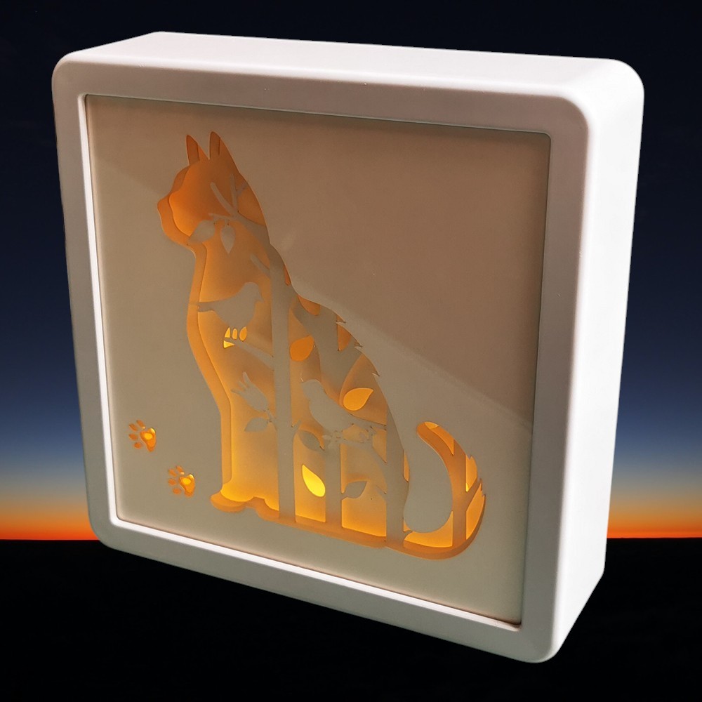 Die „3D Papercut Lightbox - Katze" besticht durch ihr liebevolles Design und die sorgfältig herausgearbeiteten Details. Das verspielte Motiv ist in vier verschiedene Ebenen aufgeteilt und erzeugt dadurch einen faszinierenden 3D-Effekt, der bei eingeschalteter Beleuchtung besonders schön hervorgehoben wird. Die Silhouette der Katze ist im Hintergrund mit einer Waldszene ausgeschmückt und wird durch zwei kleine Pfötchen am Rand ergänzt. Durch den robusten Rahmen und der bruchsicheren Acrylglasfront eignen sich unsere Lightboxen hervorragend als Dekorationsobjekt in Kinder - und Wohnzimmern, Wintergärten oder auf der Terrasse. Das Papiermotiv im Inneren wird durch die Hintergrundbeleuchtung mit einem warmweißen Licht wunderschön in Szene gesetzt. Unsere Lightboxen sind ein großartiges Geschenk für Freunde und Familie! Für die Beleuchtung werden drei AA-Batterien benötigt. Diese sind nicht im Lieferumfang enthalten!
