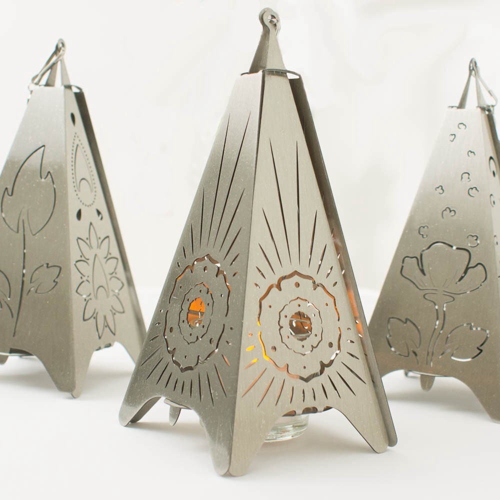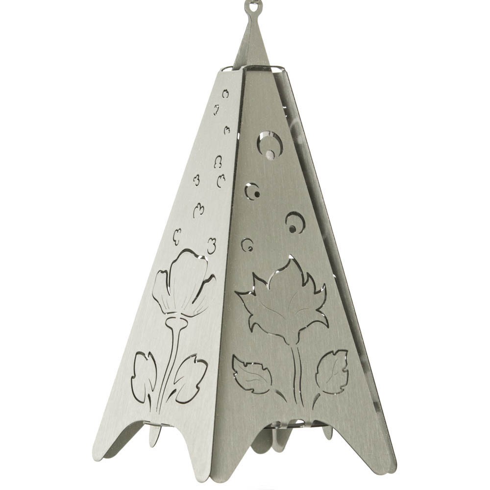 Ob als hängendes Windspiel im Garten oder als Tischdekoration im Wohnzimmer - die neuen Inner Lights haben es in sich! Die Pyramide aus gebürstetem Edelstahl lassen sich als dezente Lichtquelle mit LED-Teelicht (nicht enthalten) oder als Räucherpyramide verwenden. Der hochwertige Edelstahl mit einer Stärke von 0,8 mm ist mit einem Klarlack beschichtet, der durch den leichten Glitzereffekt für einen besonderen Schimmer sorgt. Das Motiv mit esoterischer Anmutung und floral-orientalischen Verzierungen bricht das Licht auf einzigartige Weise und zieht den Betrachter in seinen Bann. Pyramide: Teelichtglas, Karabiner und Aufhänger sind mit dabei.