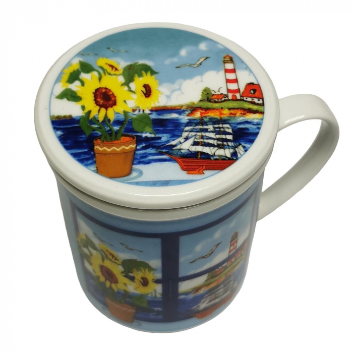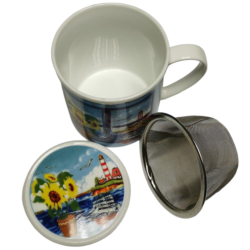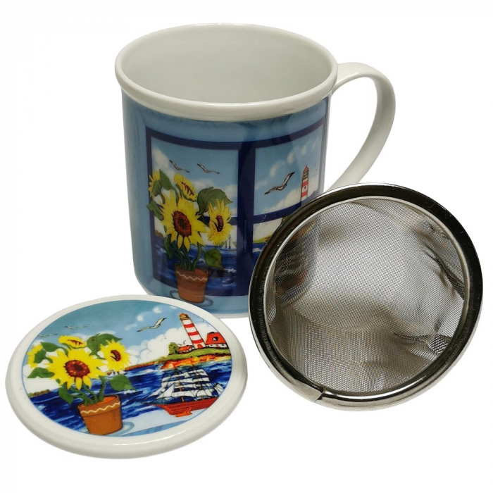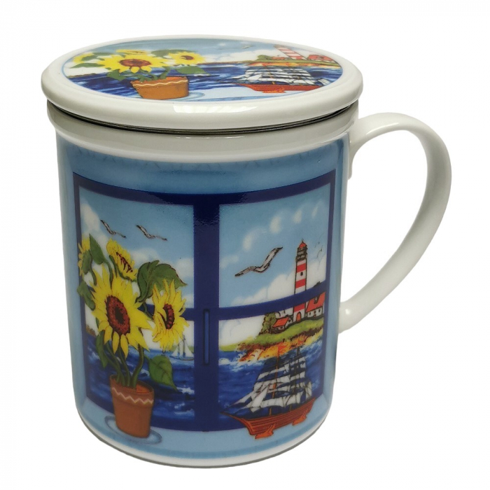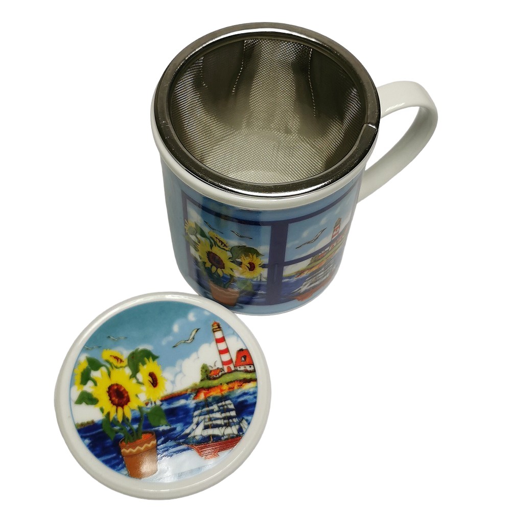 Maritime Teetasse mit Sieb & Deckel im Nordsee Design. Starten Sie in den Tag wie am Meer! Diese wunderschöne Teetasse bringt echtes Nordsee-Feeling direkt in Ihre Teestunde. Mit ihrem detailreichen Motiv aus Leuchtturm, Seemöwe und Segelschiff zaubert sie maritime Stimmung auf den Tisch und macht jede Auszeit zu einem kleinen Kurzurlaub. Dank des hochwertigen Edelstahlsiebs eignet sich die Tasse perfekt für losen Tee. Der praktische Deckel hält Ihr Getränk länger warm und kann gleichzeitig als Ablage für das Sieb dienen - sauber und unkompliziert.