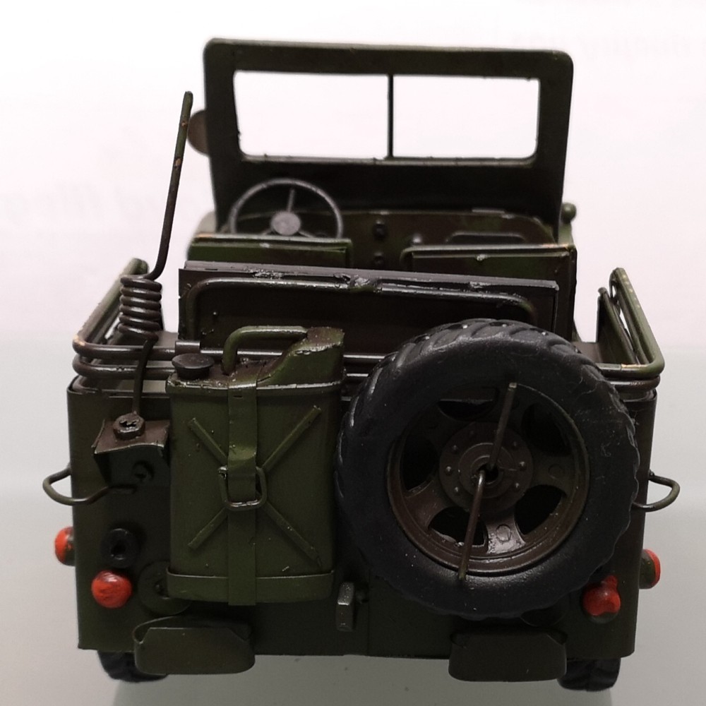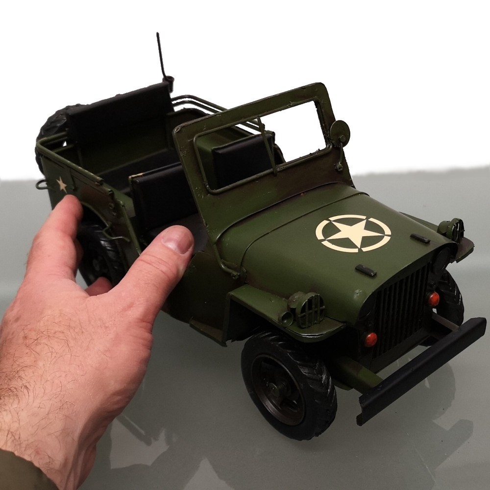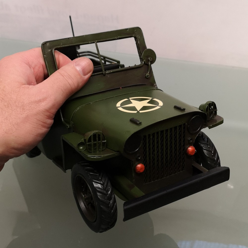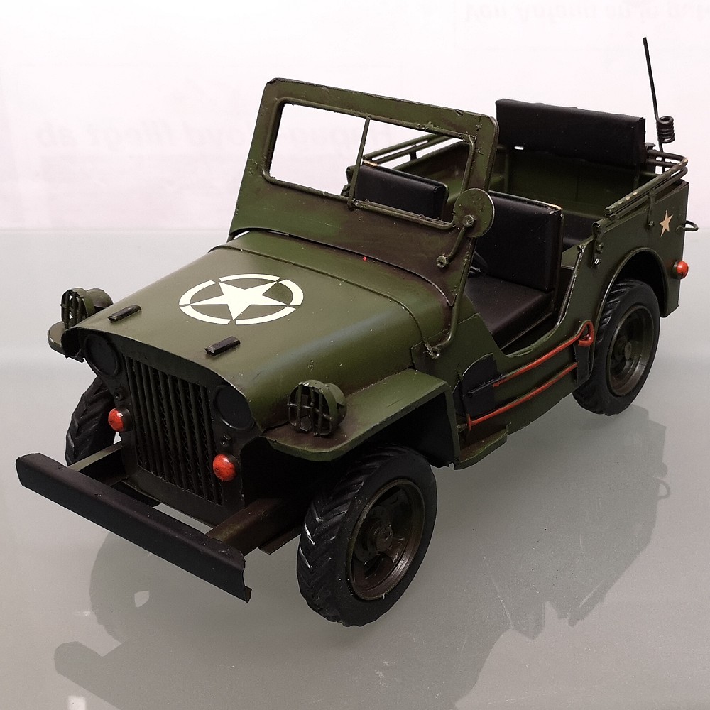 Bei diesem tollen Modell handelt es sich um eine Neuzeitliche Reproduktion eines US Army JEEP Modells der 70er Jahre. Es ist handgefertigt und handbemalt. Unregelmäßigkeiten bei der Bemalung und auch bei kleineren Details unterstreichen den nostalgischen Charme dieses Artikels und auch zugleich die Herstellung in Handarbeit. Info: es handelt sich um KEIN SPIELZEUG!