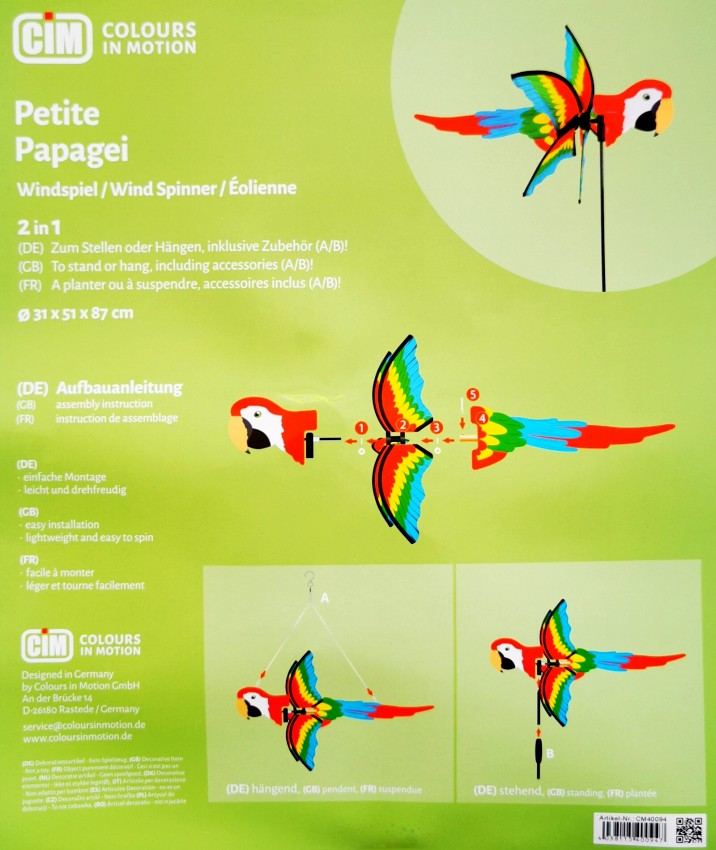 Das Windspiel PAPAGEI LORA besticht durch seine doppelte Funktionalität. Das Windspiel kann sowohl mit Haken und Schnur hängend, als auch mit Standstab als Gartenstecker dekoriert werden. Das benötigte Zubehör ist im Lieferumfang enthalten. Die Montage ist sehr einfach zu bewerkstelligen, da der im Wind drehende Propeller vormontiert ist und nur auf die Führungsstange aufgesteckt werden muss. Das Windspiele stellt sich durch sein Gleitlager leicht in den Wind und ist daher besonders drehfreudig.