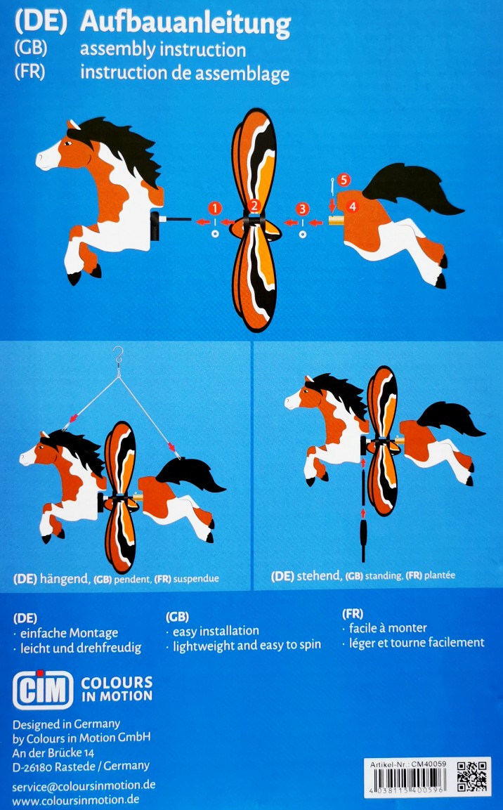 Das Windspiel PONNY FLICKA besticht durch seine doppelte Funktionalität. Das Windspiel kann sowohl mit Haken und Schnur hängend, als auch mit Standstab als Gartenstecker dekoriert werden. Das benötigte Zubehör ist im Lieferumfang enthalten. Die Montage ist sehr einfach zu bewerkstelligen, da der im Wind drehende Propeller vormontiert ist und nur auf die Führungsstange aufgesteckt werden muss. Das Windspiele stellt sich durch sein Gleitlager leicht in den Wind und ist daher besonders drehfreudig.