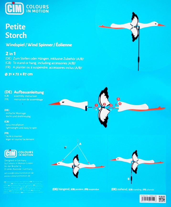 Das Windspiel STORCH Weißstorch besticht durch seine doppelte Funktionalität. Das Windspiel kann sowohl mit Haken und Schnur hängend, als auch mit Standstab als Gartenstecker dekoriert werden. Das benötigte Zubehör ist im Lieferumfang enthalten. Die Montage ist sehr einfach zu bewerkstelligen, da der im Wind drehende Propeller vormontiert ist und nur auf die Führungsstange aufgesteckt werden muss. Das Windspiele stellt sich durch sein Gleitlager leicht in den Wind und ist daher besonders drehfreudig.