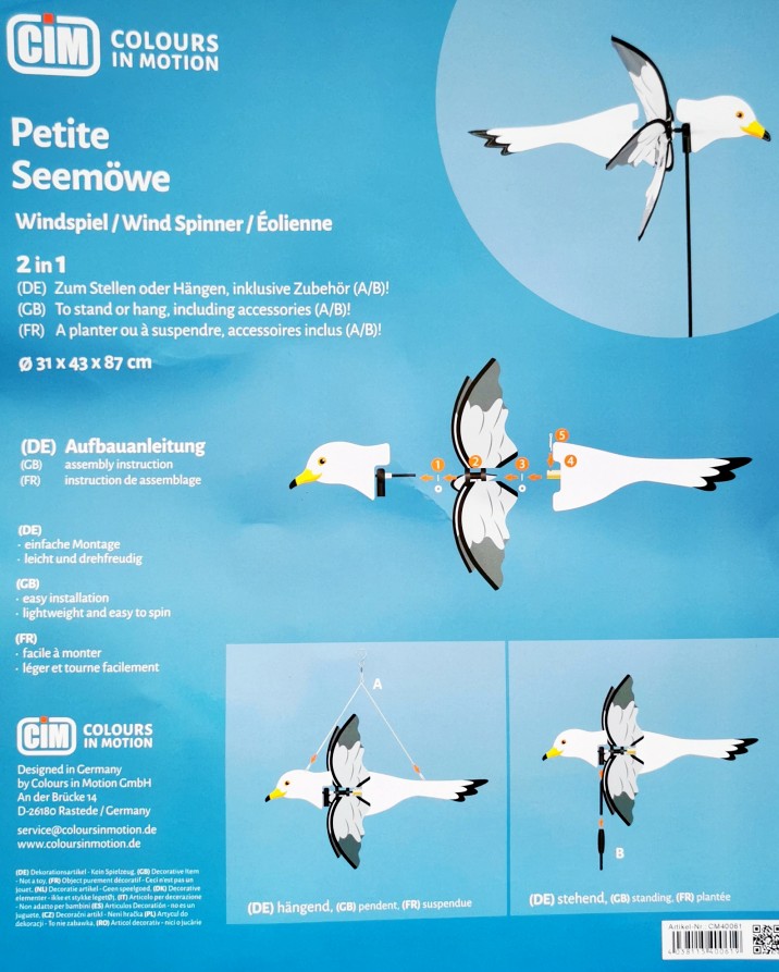 Das Windspiel VOGEL SEEMÖWE Möwe besticht durch seine doppelte Funktionalität. Das Windspiel kann sowohl mit Haken und Schnur hängend, als auch mit Standstab als Gartenstecker dekoriert werden. Das benötigte Zubehör ist im Lieferumfang enthalten. Die Montage ist sehr einfach zu bewerkstelligen, da der im Wind drehende Propeller vormontiert ist und nur auf die Führungsstange aufgesteckt werden muss. Das Windspiele stellt sich durch sein Gleitlager leicht in den Wind und ist daher besonders drehfreudig.