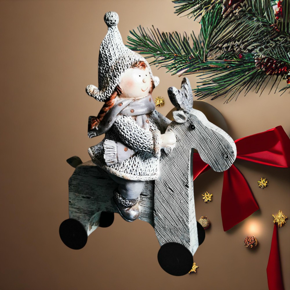 Zauberhafte Winterfigur auf Rentier – liebevolle Weihnachtsdeko für ein gemütliches Zuhause. Diese detailreich gestaltete Winterfigur bringt sofort eine warme, festliche Atmosphäre in Ihr Zuhause. Die kleine Figur, gekleidet in ein gestricktes Winteroutfit mit Mütze, Schal und Mantel, sitzt fröhlich auf einem stilisierten Holzrentier. Mit ihrem freundlichen Gesichtsausdruck und den zarten Farbakzenten verleiht sie jedem Raum einen besonderen Hauch von Winterromantik. Die Kombination aus strukturierter Strickoptik, rustikalem Holzlook und dezenten, warmen Farbtönen macht diese Dekoration zu einem echten Blickfang – sei es auf dem Fensterbrett, dem Sideboard oder als Teil eines weihnachtlichen Arrangements. Mit dieser charmanten Weihnachtsfigur schaffen Sie im Handumdrehen eine gemütliche, winterliche Stimmung – ein perfektes Accessoire für die Adventszeit oder als Geschenk für Deko-Liebhaber.