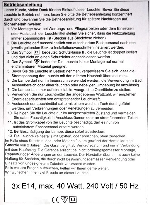 Hinweis: diese Lampe entspricht den Anforderungen der DIN 60598 und ist entsprechend gekennzeichnet. Sie ist mit einer Gebrauchsanweisung und 2 Jahren Garantie auf alle elektrischen Teile ausgestattet. Die Leuchte wird fertig montiert mit drei E14 Fassungen, 2 mtr. Kabel und Ein/Aus Schalter geliefert. Leuchtmittel werden nicht mitgeliefert. Zur Verwendung kommen entweder max. 40 Watt Glühbirnen oder eine Energiesparlampe. ENERGIEEFFIZIENZKLASSE: Diese Leuchte ist geeignet für Leuchtmittel der Energieklasse: A++, A+, A, B, C, D, E.